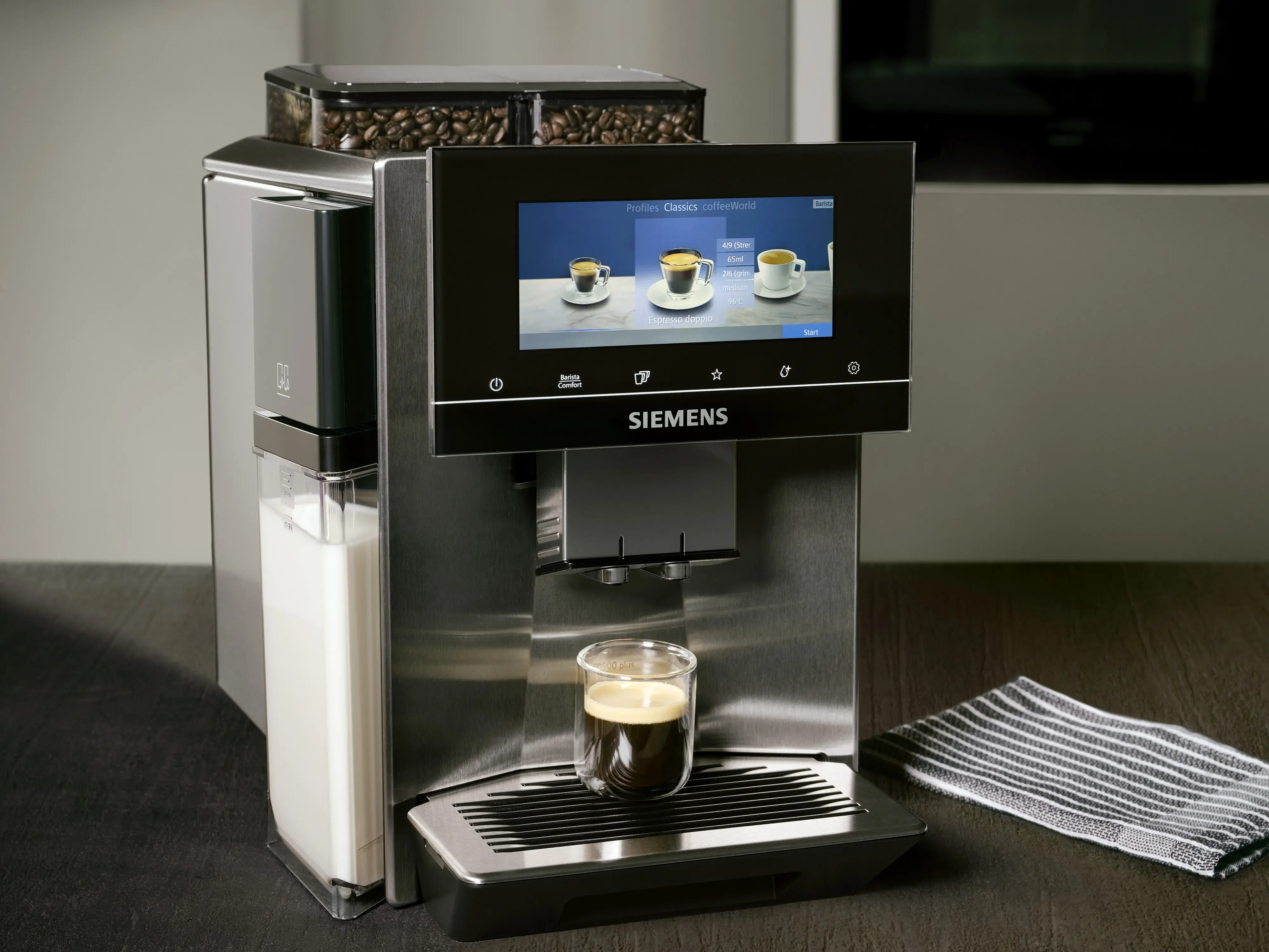 Kreieren Sie einen Kaffee, der Ihren individuellen Vorlieben entspricht â ganz wie ein Barista. Das intuitive Full-Touch Display erlaubt Ihnen eine nuancenreiche Einstellung fĂŒr Ihren Lieblingskaffee. Bei einem Modell mit zwei BohnenbehĂ€ltern und eGrinder lassen Sie sich Ihre Kaffeebohnen vom Siemens EQ900 Kaffeevollautomaten so prĂ€zise mahlen, wie es Ihr GetrĂ€nkewunsch verlangt. Und das Beste: Alles funktioniert superSilent, mit deutlicher GerĂ€uschreduzierung fĂŒr entspannten Kaffeegenuss.